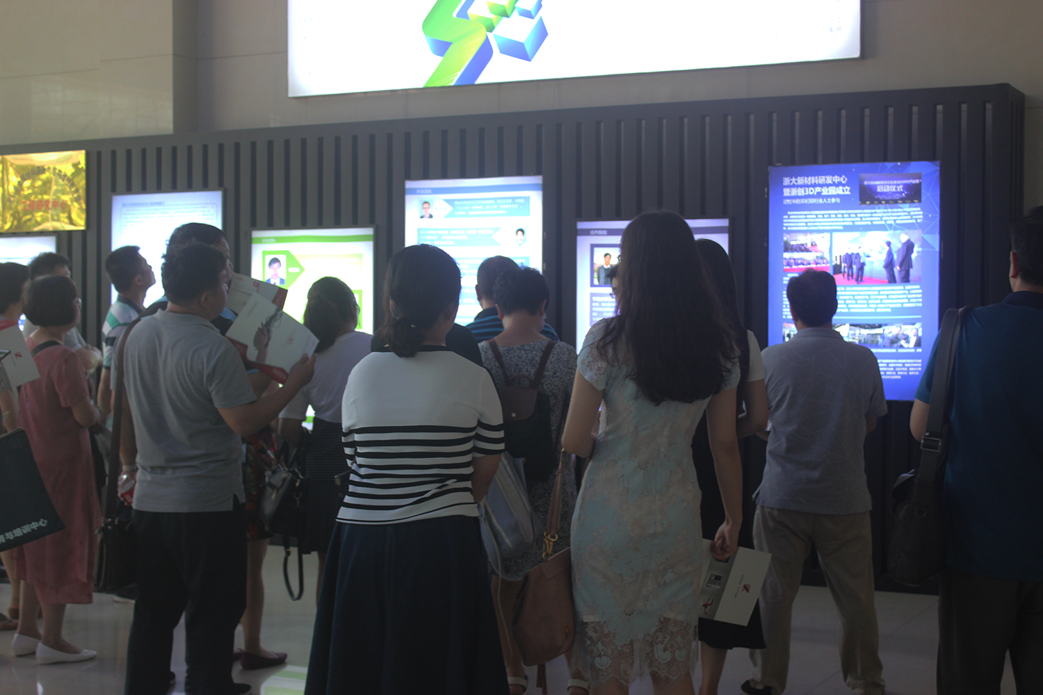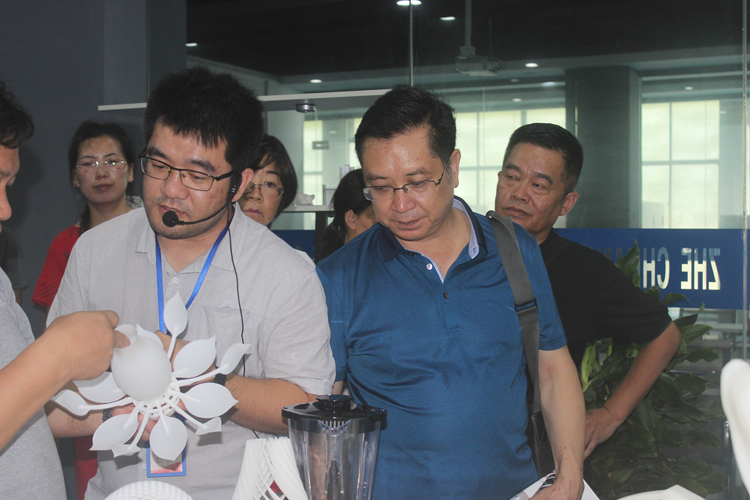 隨后,參訪領導一行參觀了生產車間,對浙創科技的技術力量、機械設備、產品研發進行了了解。在浙創科技的樣品間,陶總親自向參訪領導介紹了公司與浙大聯合研發的光敏樹脂,以及光敏樹脂打印出的產品,并通過幾個典型的3D打印模型,具象的介紹了3D打印的優點。