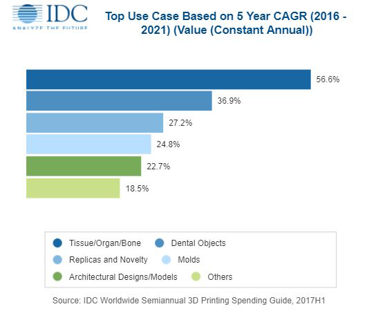 預(yù)計醫(yī)療保健業(yè)經(jīng)歷最快的增長,估計復(fù)合年增長率(CAGR)達(dá)到35.4%。用于組織,器官和骨骼的3D打印/生物打印解決方案被認(rèn)為是領(lǐng)先的花費。