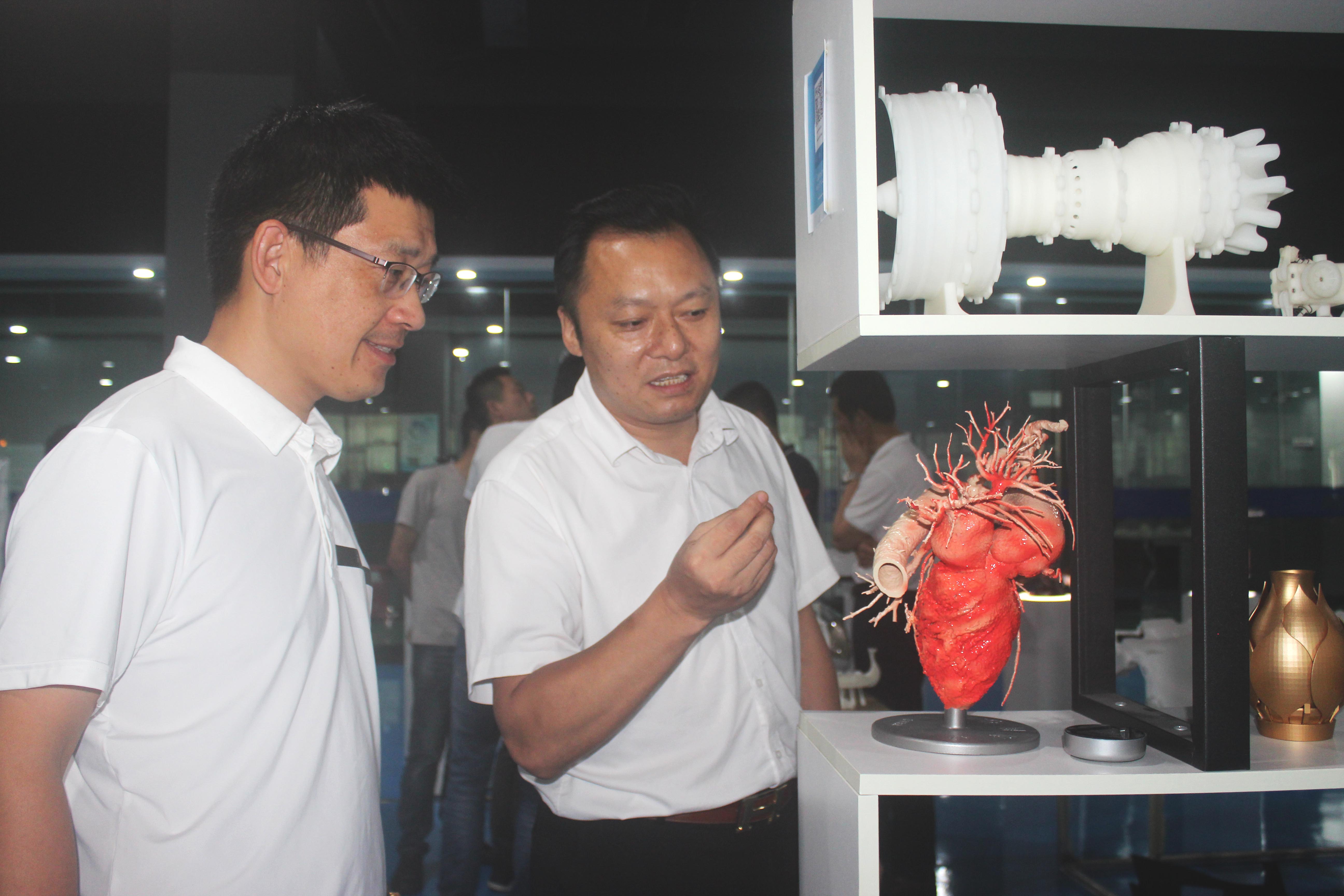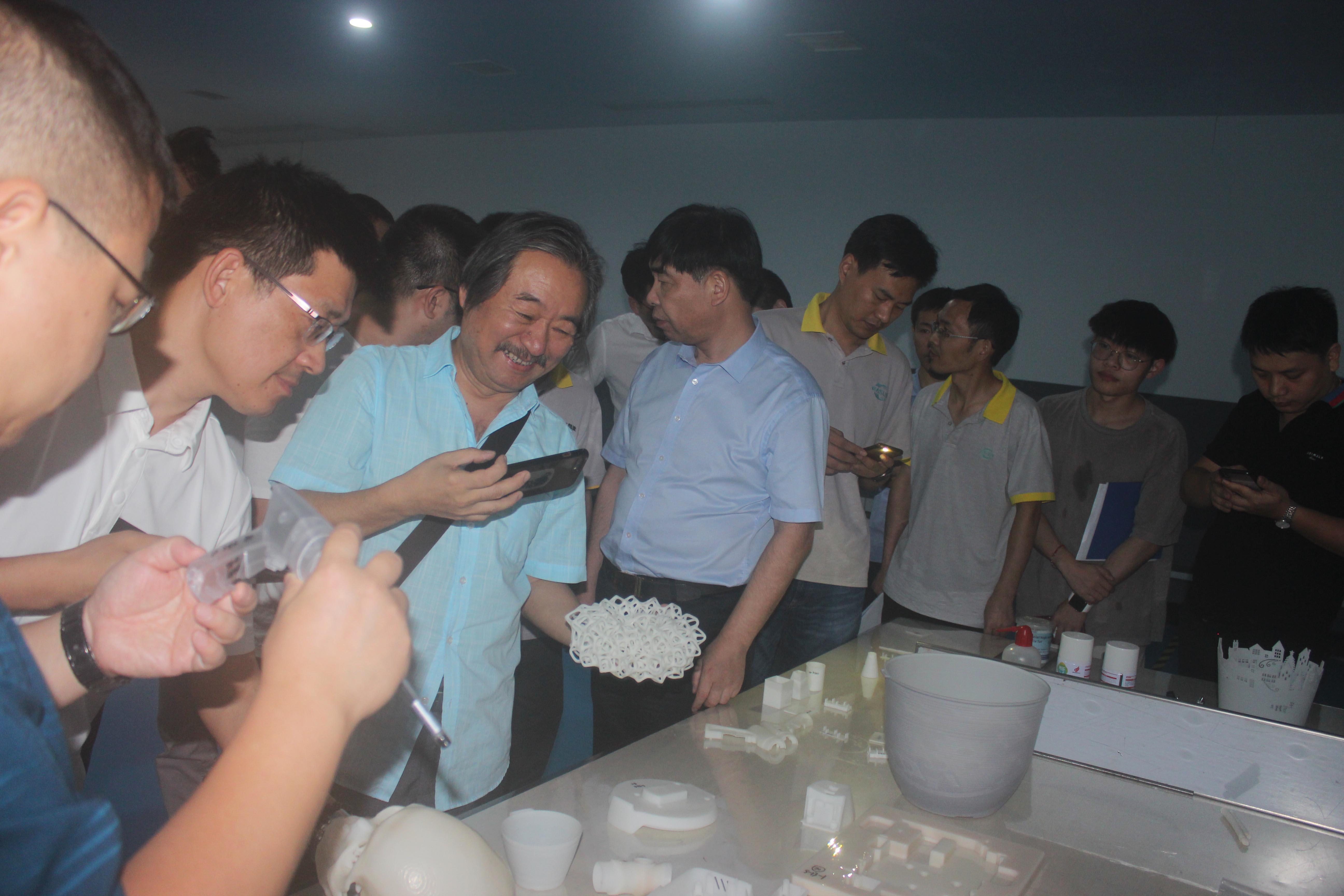 在會議結束后,來自各大企業的代表在我司領導下參觀了3D打印車間以及3D打印樣品間。近距離觀摩我司自主研發的SLA工業級3D打印機工作過程,以及3D打印在汽車配件、日用家電、文創教育等領域的具體應用案例。